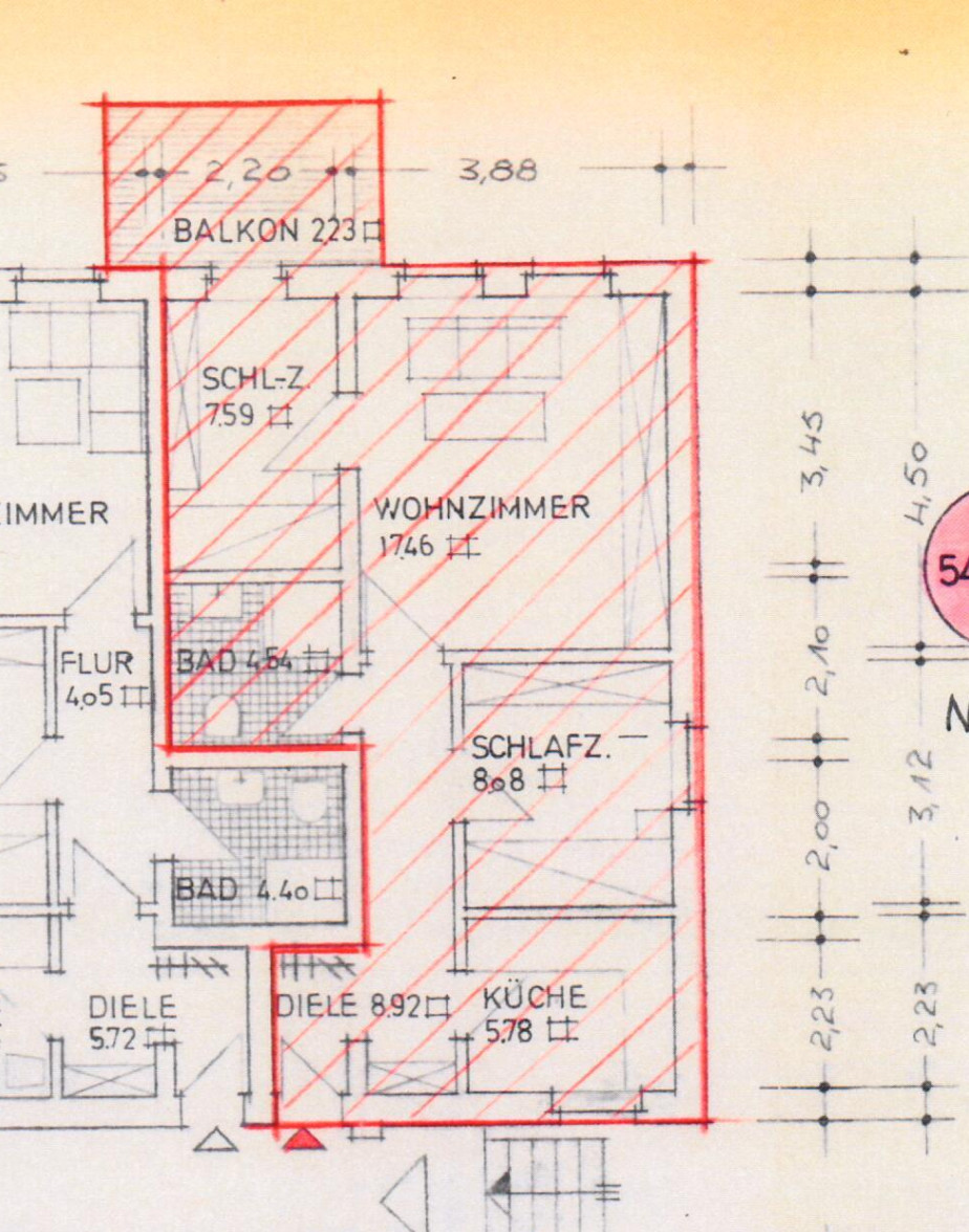 Wohnfläche: ca. 55 m² Aufteilung: 2-Zimmer, Küche, Bad, Balkon Baujahr: 1939 Nettokaltmiete: 400 € / 7,27 €/m² (Mieterhöhung zum 01.08.2025) Nebenkosten-Vorauszahlung: 159 € Heizung: Gasetagenheizung Fenster: teilweise neue 2-fach-Schallschutz (2021)