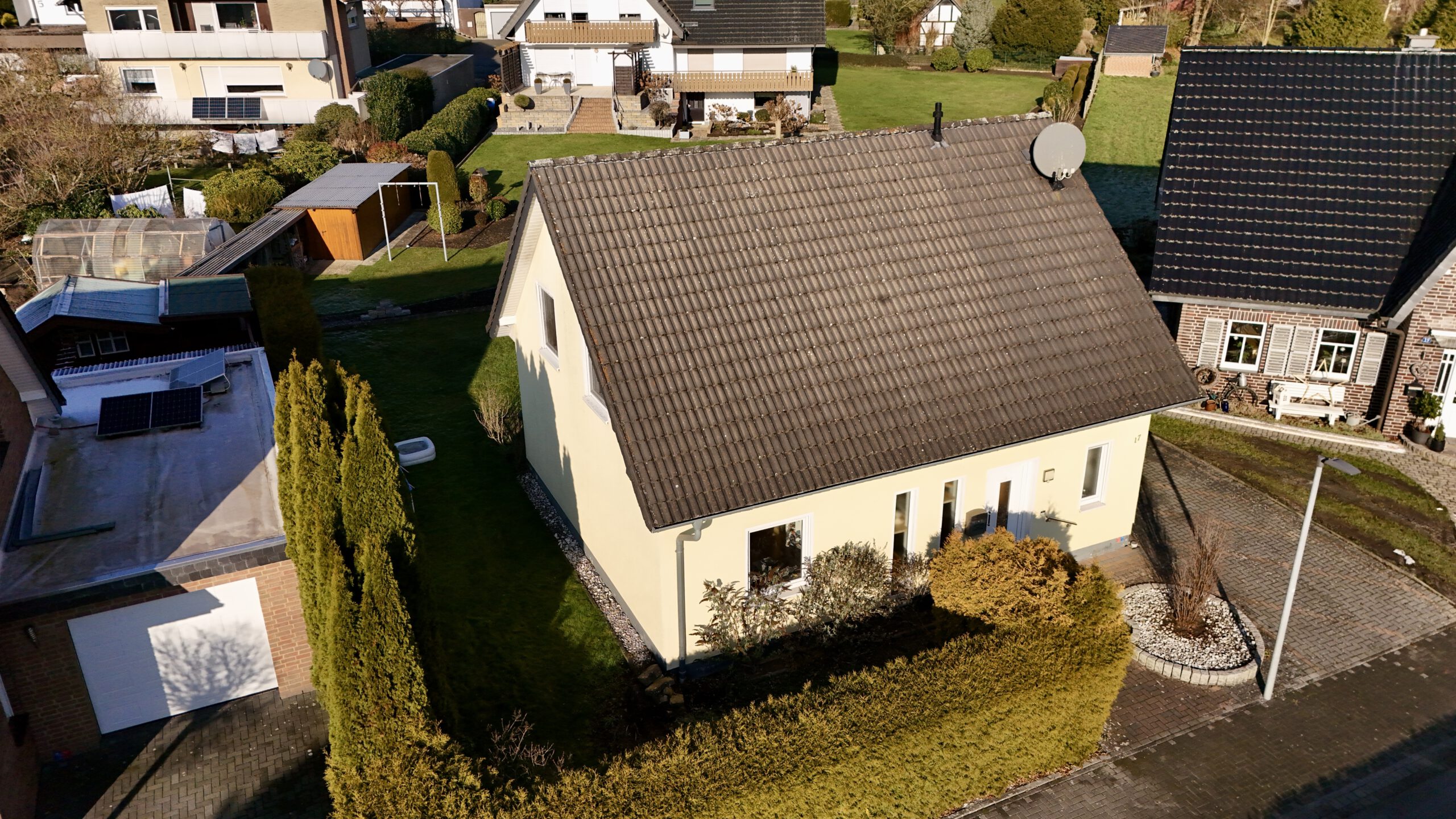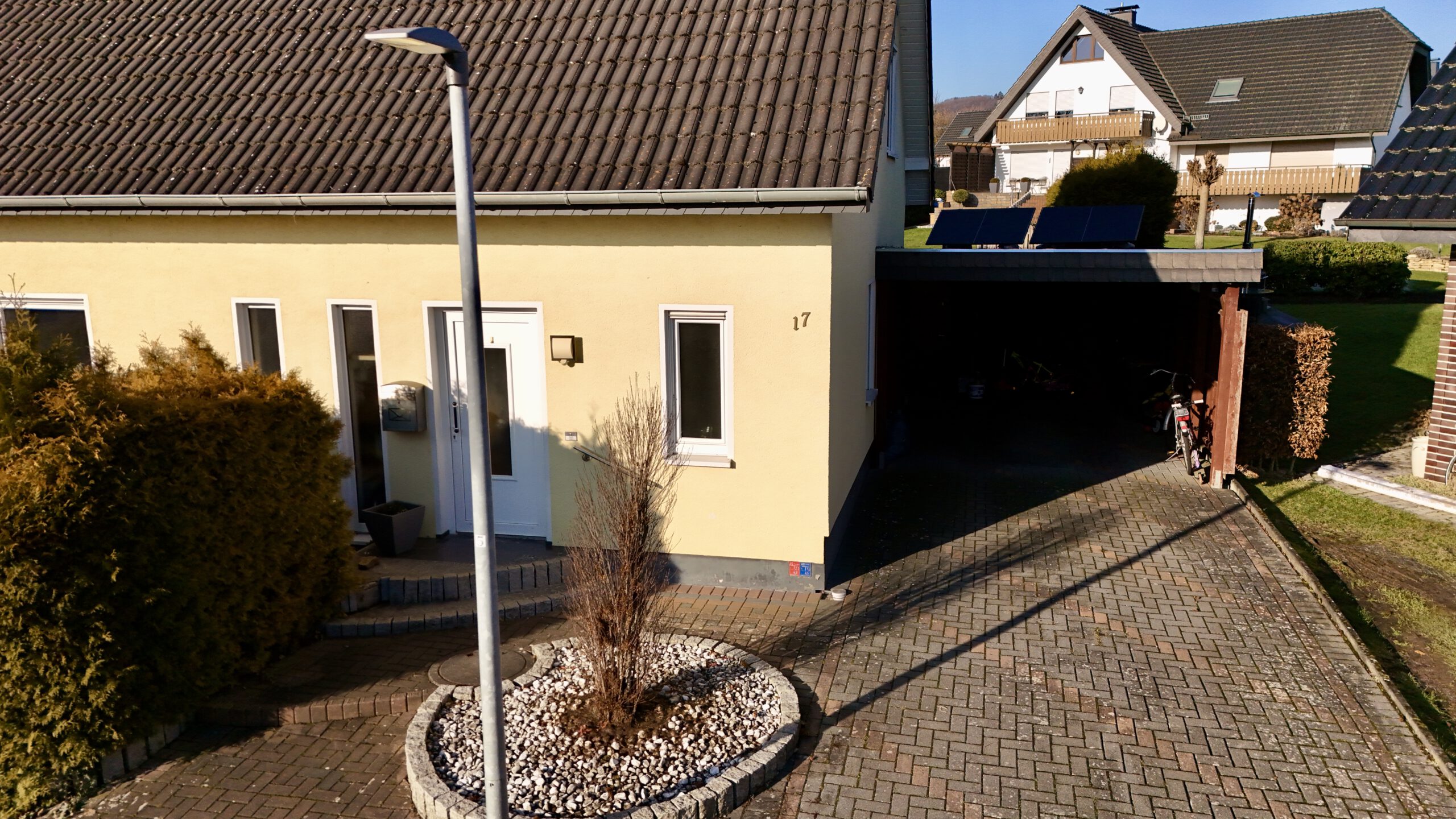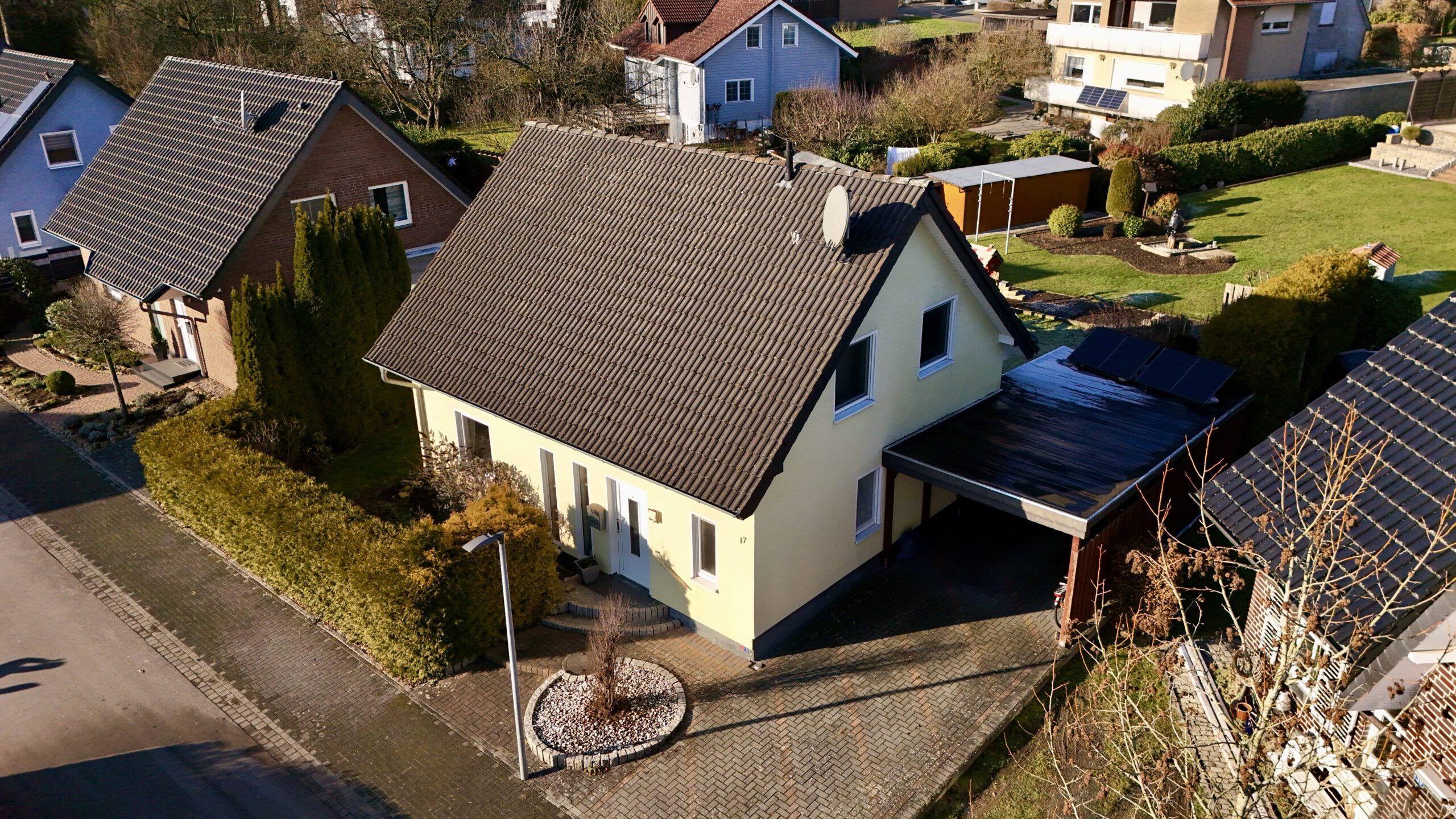 Dieses gepflegte Einfamilienhaus aus dem Baujahr 2002 bietet mit ca. 121 m² Wohnfläche und insgesamt 5 Zimmern ein ideales Zuhause für Familien oder Paare mit Platzbedarf. Die Wohnfläche verteilt sich auf zwei Etagen und überzeugt durch eine funktionale, alltagstaugliche Raumaufteilung. Vier Schlafzimmer ermöglichen flexible Nutzungsmöglichkeiten – ob Kinderzimmer, Gästezimmer oder Homeoffice. Ergänzt wird das Raumangebot durch ein Badezimmer sowie ein separates Gäste-WC. Der helle Wohnbereich bildet den Mittelpunkt des Hauses und bietet direkten Zugang zur Terrasse. Auch von der Küche aus gelangt man unmittelbar in den Garten- und Terrassenbereich, was den Alltag besonders komfortabel macht und kurze Wege ins Freie ermöglicht. Die Terrasse lädt zu entspannten Stunden im Freien ein. Das ca. 437 m² große Grundstück ist pflegeleicht und bietet dennoch ausreichend Platz für Freizeit, Garten oder Spielmöglichkeiten. Ein Carport sorgt für komfortables Parken direkt am Haus. Das Haus wird über eine Gasheizung (Flüssiggas) beheizt. Der vorhandene Verbrauchsausweis weist einen Endenergieverbrauch von 70,10 kWh/(m²·a) aus und ordnet die Immobilie der Energieeffizienzklasse B zu. Warmwasser ist im Energieverbrauch enthalten – ein Pluspunkt im Hinblick auf laufende Kosten und Zukunftssicherheit. Die Ausstattungsqualität ist als gepflegt zu bezeichnen und bietet eine solide Basis für individuelles Wohnen ohne unmittelbaren Renovierungsbedarf. Insgesamt handelt es sich um ein attraktives Haus mit angenehmem Wohnkomfort, das sowohl funktional als auch wirtschaftlich überzeugt.